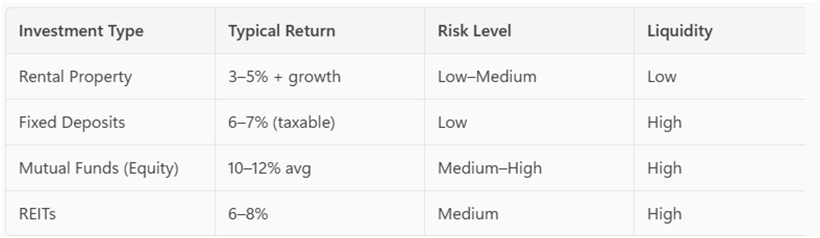 A 4% rental yield may not sound exciting at first glance, but when you factor in capital appreciation, tax benefits, and leverage, it becomes a compelling option for long-term wealth creation. It’s especially attractive for investors seeking stable income and low volatility.